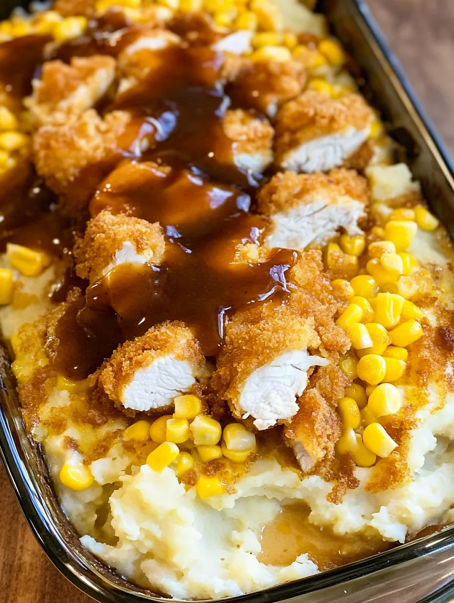 This mashed potato casserole combines creamy potatoes with crispy chicken strips, sweet corn, and melty cheese, all brought together with a savory brown gravy. It's the ultimate comfort food that transforms simple ingredients into a satisfying meal that's perfect for busy weeknights or Sunday family dinners.